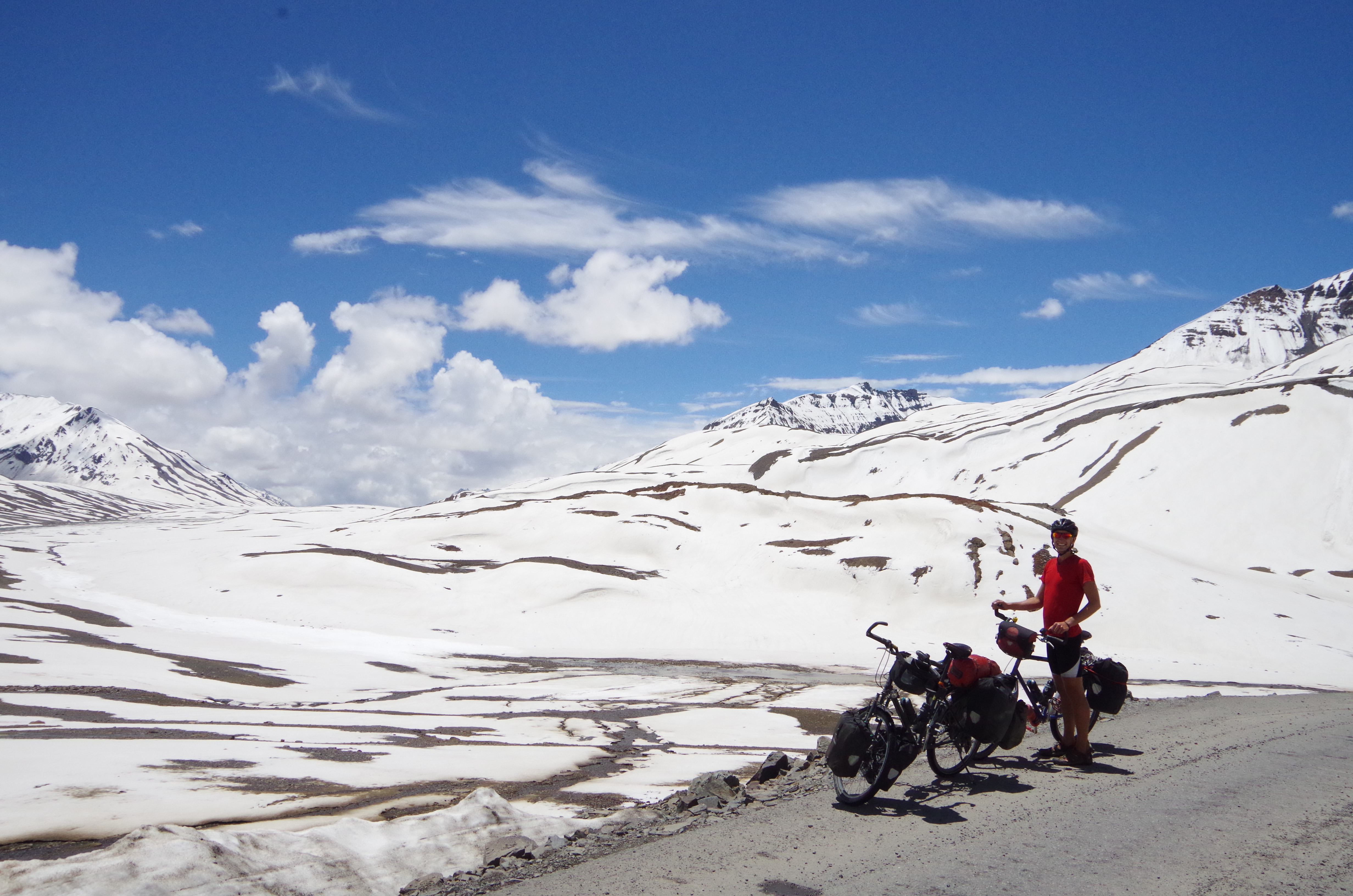 We were back in the saddle and climbing again. With a menu of wild camping, river washing and one ring burner delicacies ahead, happy faces were on. Rising beyond 4000m our friend the altitude kicked in and we stopped for a nights rest and acclimatisation in Zing Zing Bar, a half horse town.  The lungs were raring to go the following morning and the remaining climb to 4900m was made all the easier. A stunning snow scape awaited and another beguiling face of Madam Himalaya 🙂