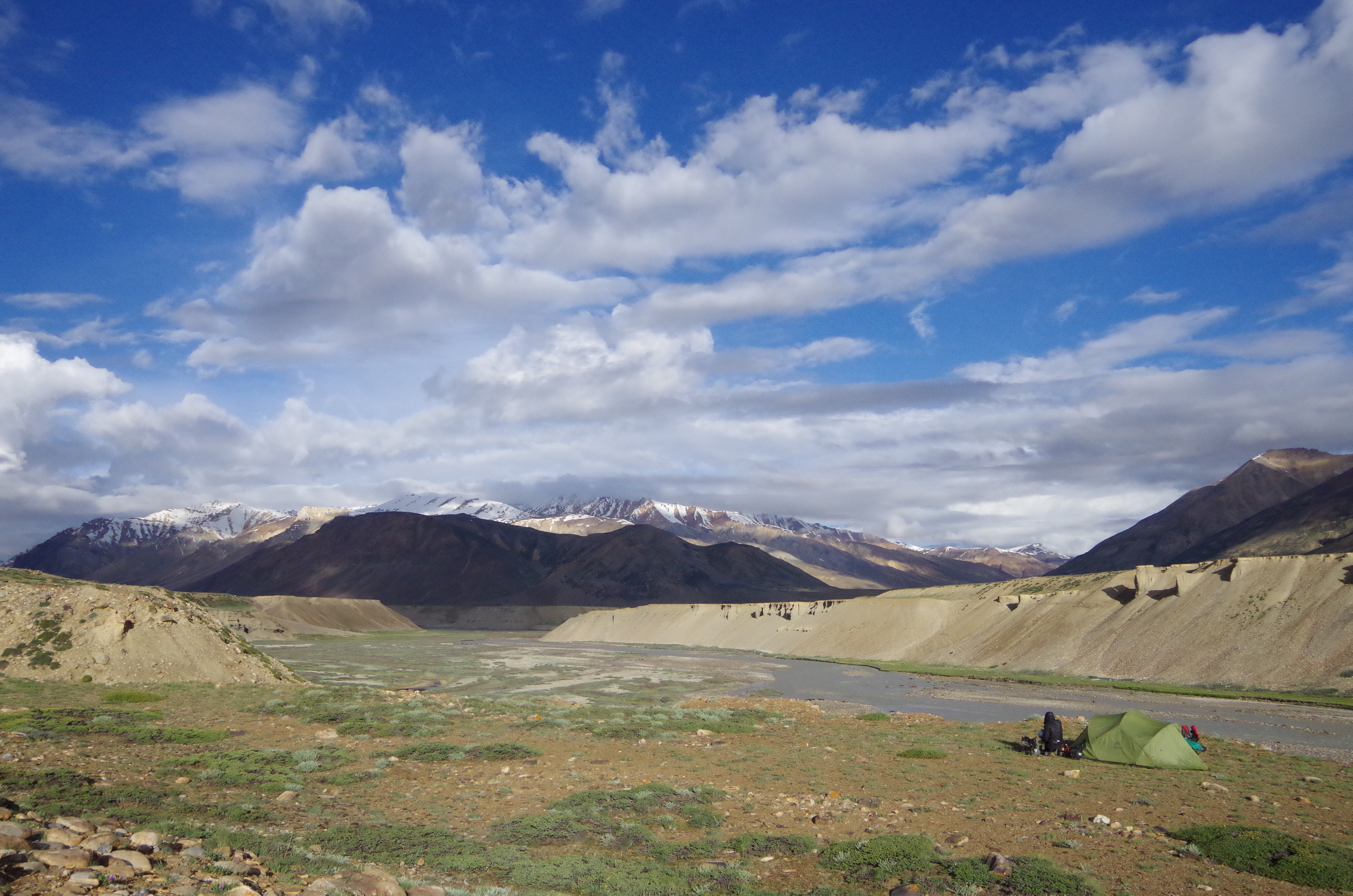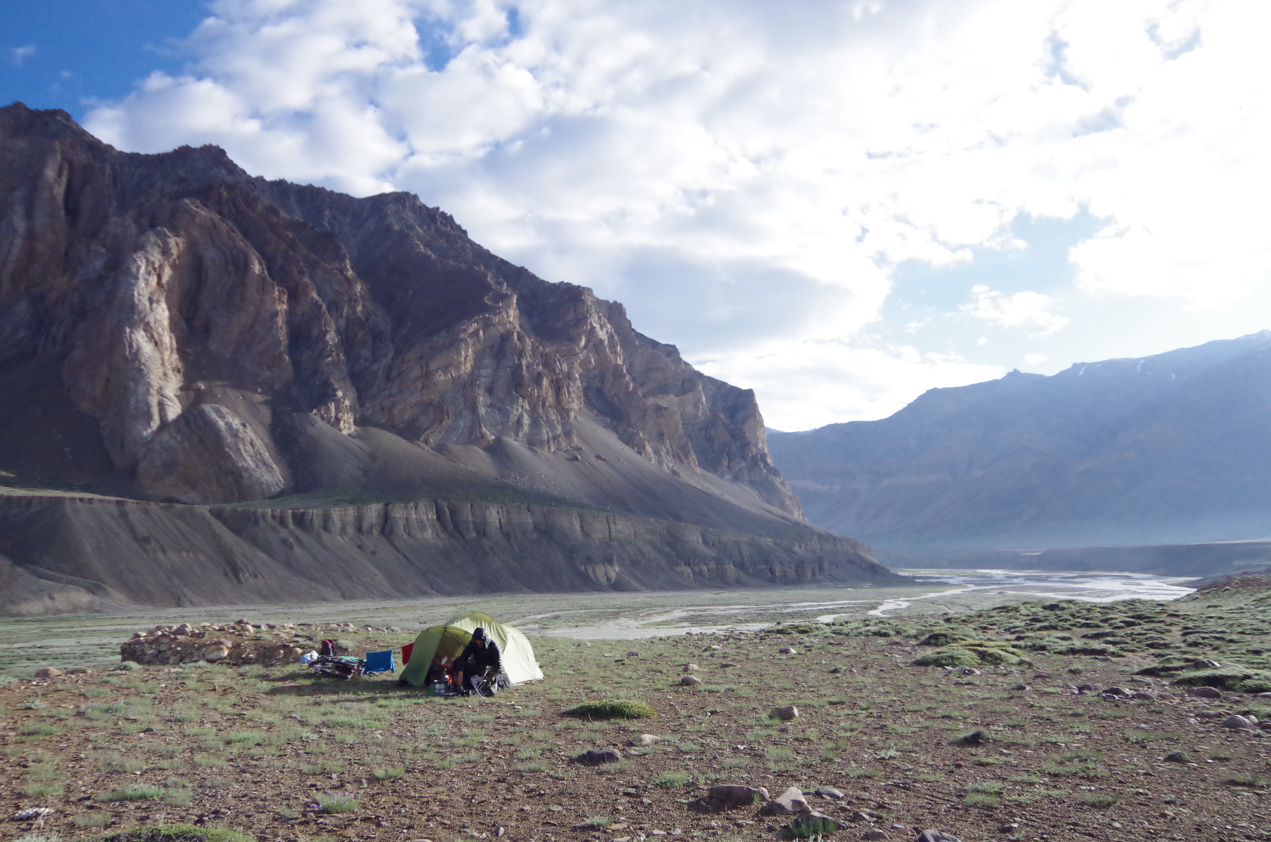 As the downpour began, we huddled in a Dhaba in the make shift town of Sarchu.  Upon the clouds clearing we headed off-road for 1km, with still enough food from our re-stock in Keylong, to take our rest day in the tent.  We pitched at the fork of two rivers, took our birthday suited washes in the glacial mountain stream and bedded down for a peaceful nights kip.  The following day was spent in wonder as we witnessed the weather system we’d seen the day before build from a sunny rainbow clad morning to a dark gloomy afternoon and a tempestuous evening.  It was heaven to get reacquainted with our familiar tarpaulin home and we took to the road again feeling refreshed.