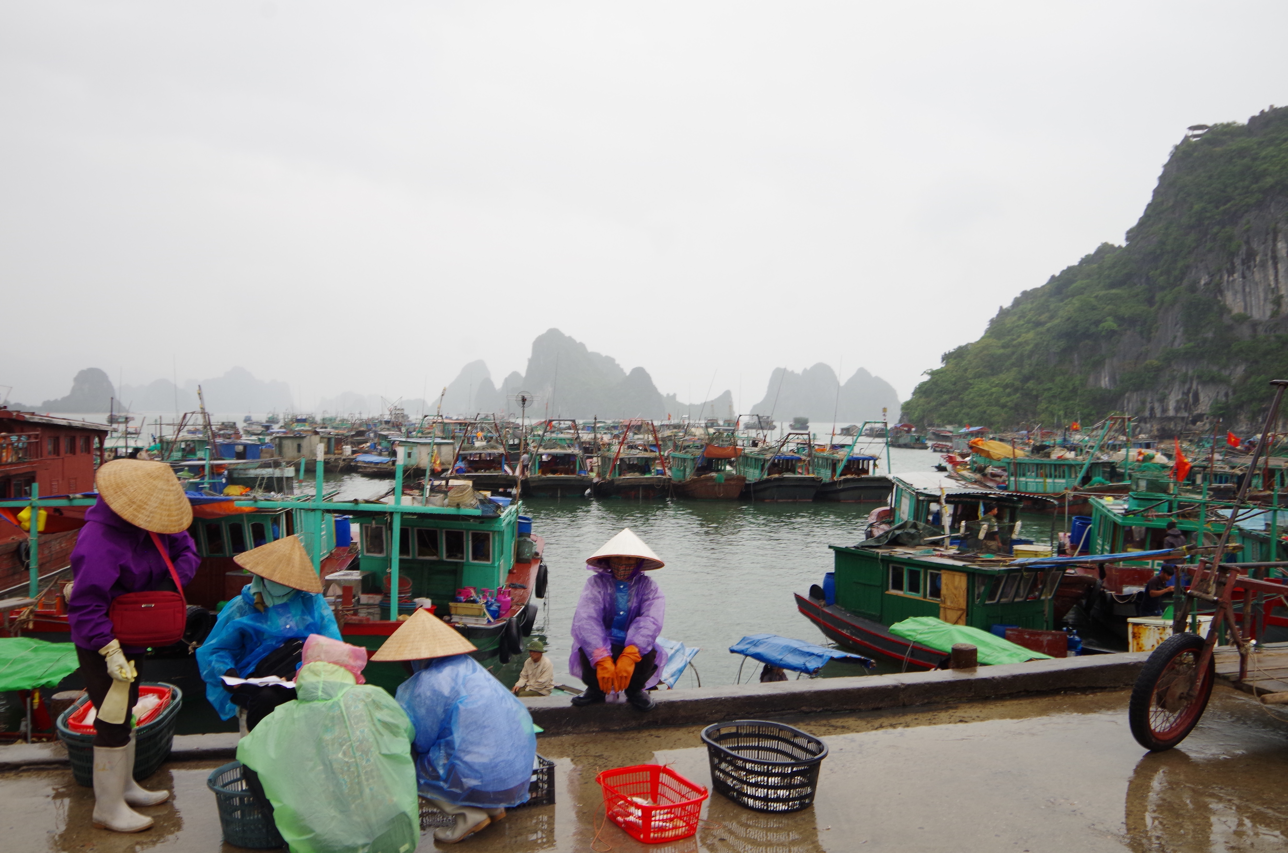 The desire to stay in one piece saw us grabbing a coach to Halong.  From there we cycled North for a boat to the island of Cuan Do.  This government slow boat jugged us through the sea field of limestone karsts for which this region is famous.  Mountain peaks appear to hover and float above the sea.  Interspersed with vast fisheries in the calm shelters of their horseshoe structures.