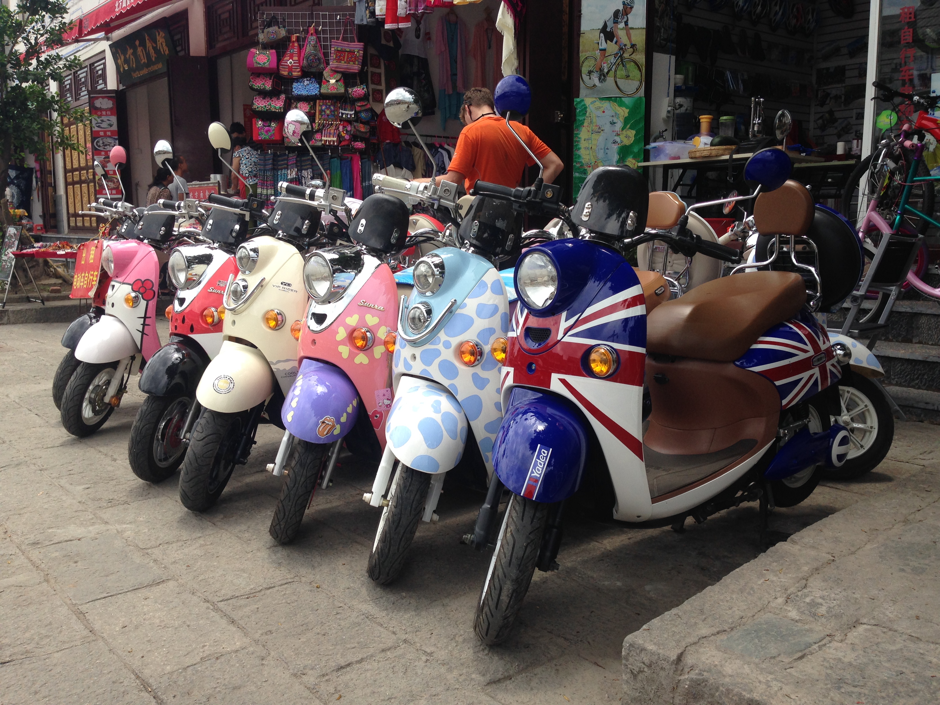 Amongst the hustle and bustle of these ‘ancient towns’ it’s pleasing to see the focus on recycling and renewable energy. Since arriving in China we’ve seen very few petrol powered scooters. Everything is electric and no design to kitsch. From Hello Kitty to Union Jacks and bubble gum pop that makes your eyes hurt. Though these silent hairdryers make crossing roads all the more perilous.