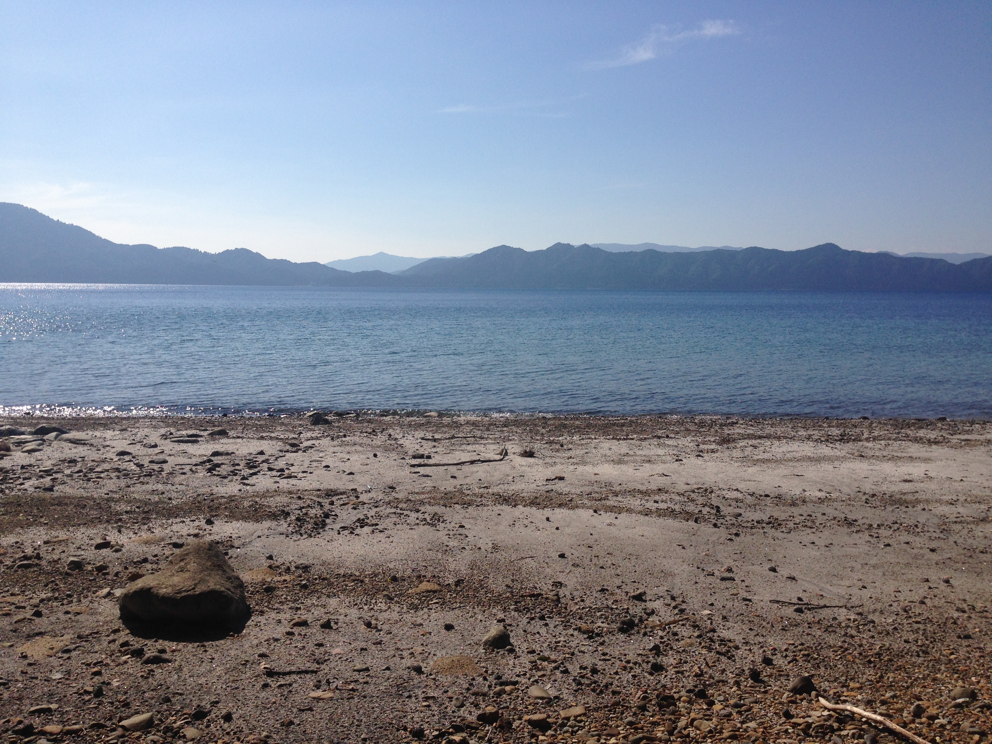An (almost) white sand beach at Lake Tazawa