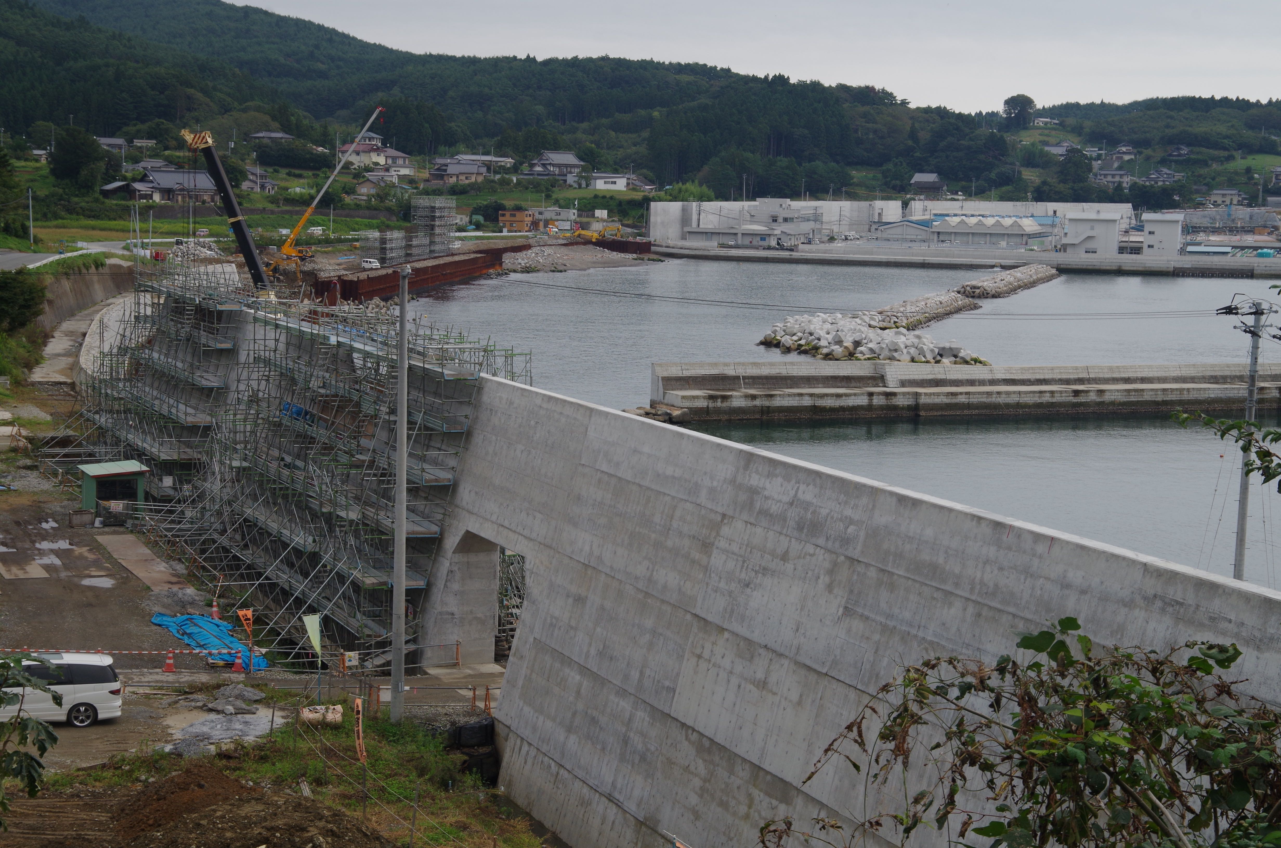 11th March 2011 is a day that scars the soul of Japan.  An 9.0 earthquake hit their Eastern sea board generating a 25m Tsunami. Sanriku Coast felt the brunt. ‘Ria bay‘ formations with long inlets and narrow bays exacerbating the devastation.  Whole towns wiped out in minutes. 1000’s dead and injured.  And then the rebuilding began. 25m walls lacing every inlet. Coastal land and valleys being raised by 30m with soil stolen from the surrounding mountains.  Construction on an epic scale. (Click here for before and after satellite images ).