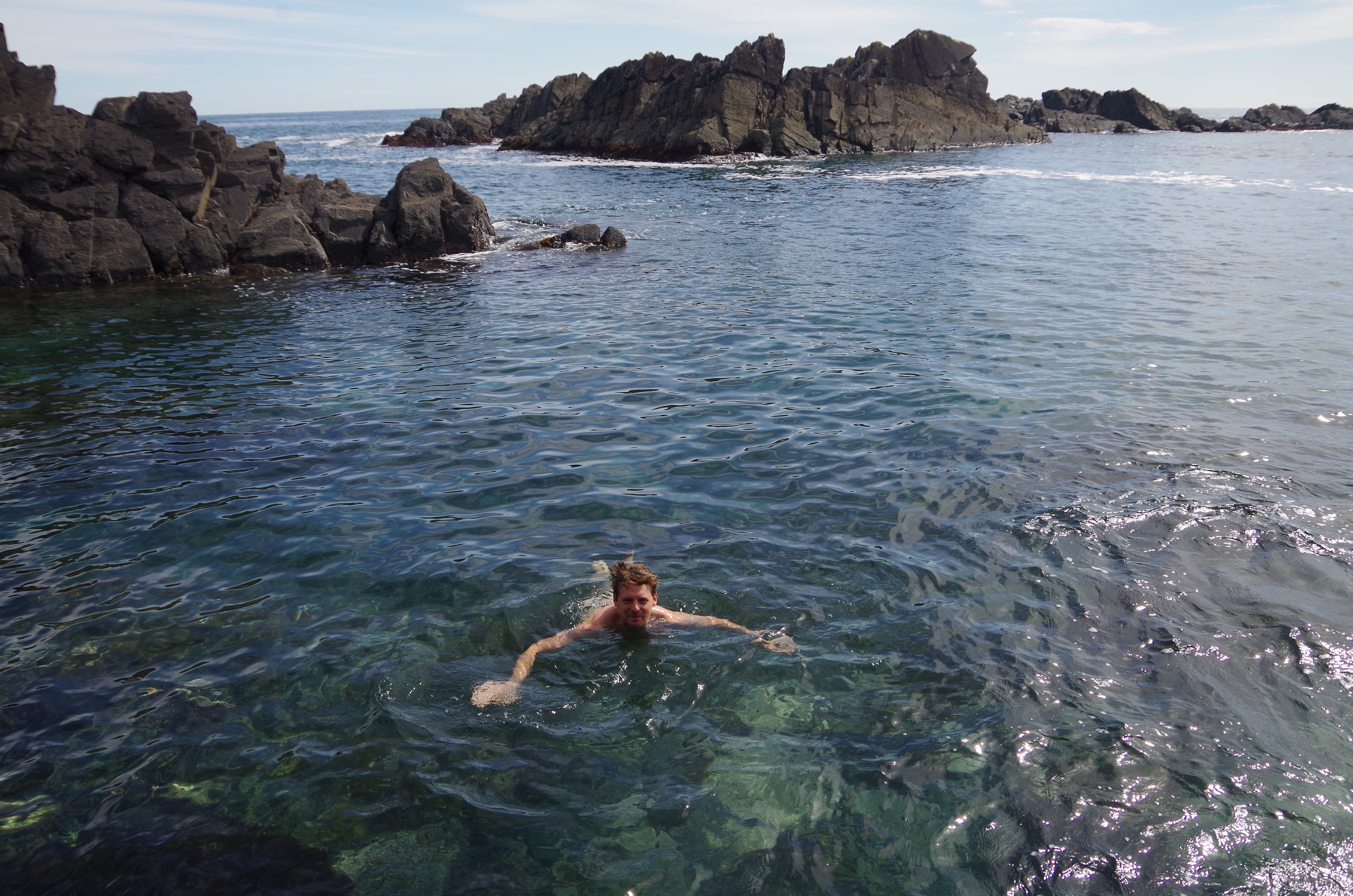 The coastline is as wondrous as we’ve come to expect.  Sheer black cliffs and headlands, shaded in pine trees with sapphire water rumbling and sparkling beyond.