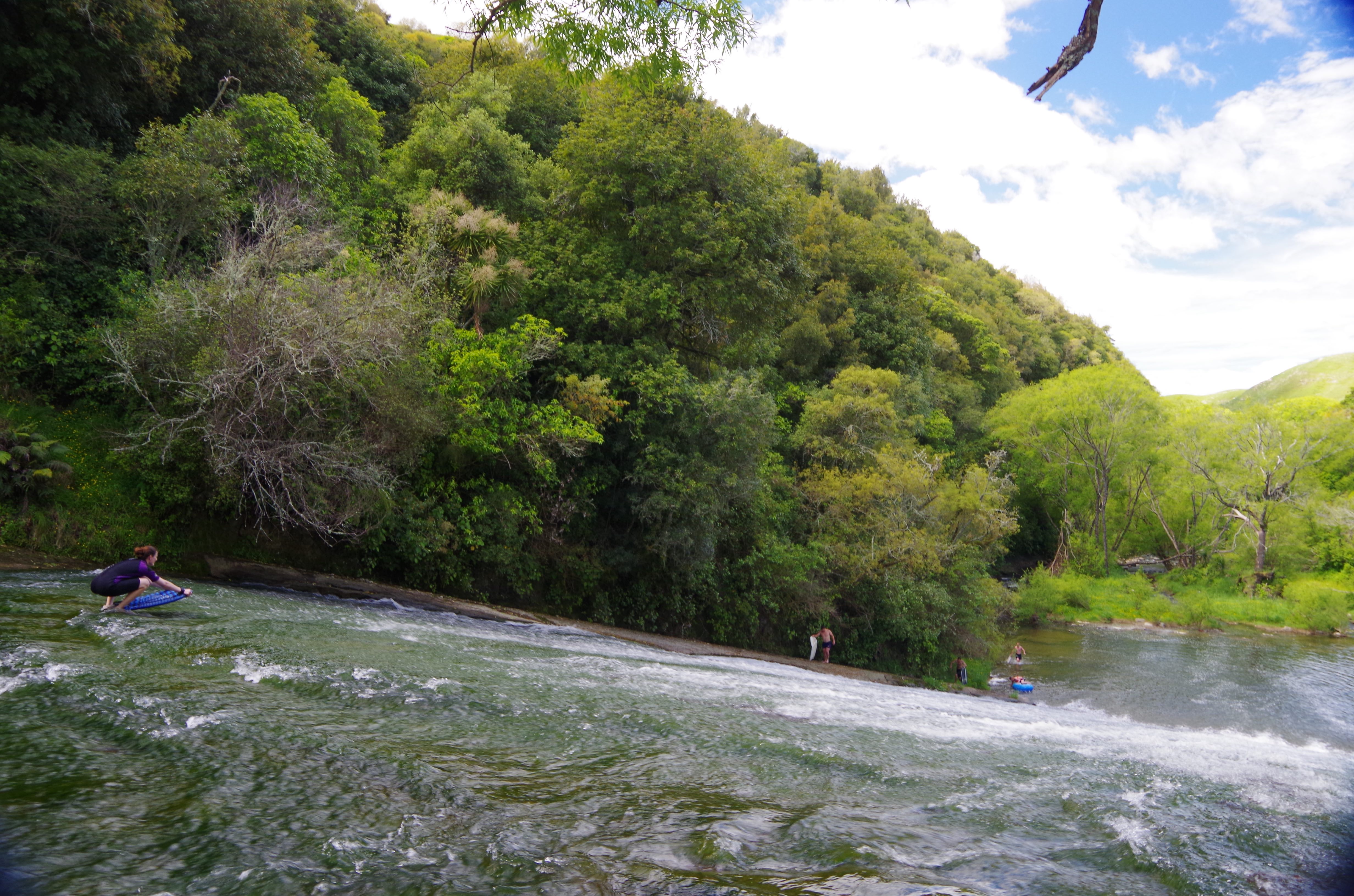 Two days and we arrived in Taupo where we were greeted by snow capped mountains on the Southern shore of this beautiful lakeside town.  En route we kept ourselves warm along the ‘Hot Springs Highway’ in some rustic hot streams and learnt the dangers of camping in farmers fields, as we scrapped the pats off our ground sheet the following morning.  A night free camping by the emerald freezing run off stream from the lake and we were up and over the never ending hills to reach Pureora Forest.
