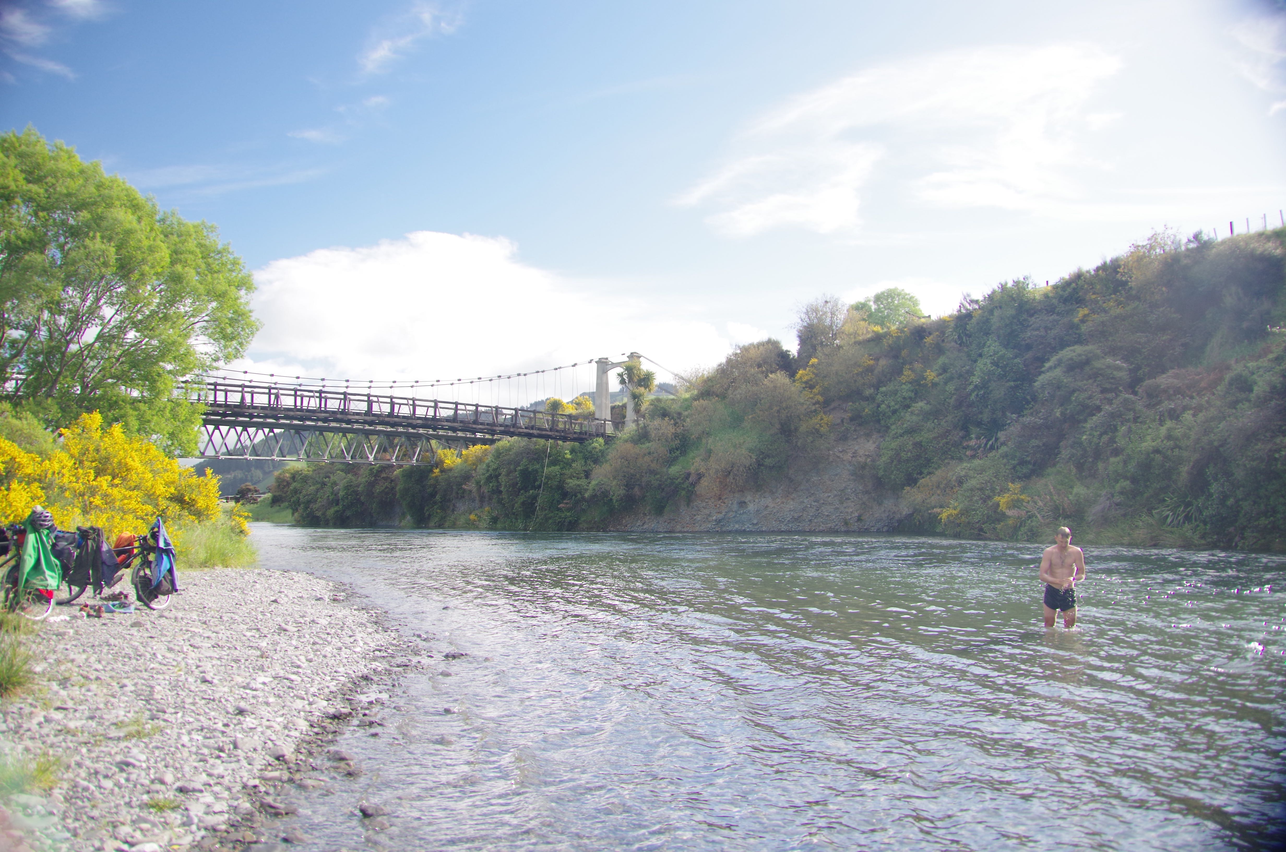 After two days sitting out hurricane winds and rain on the edge of Tongariro National park we began our peddle to the coast.  Sunshine and the inevitable rolling green hills soon met us on the route West.  In the middle of a vast ocean NZ’s winds chop and change from warm North Westerlies to cold South Easterlies, often in the drum of a heartbeat.  Coming off the hills for a night camping in Hastings the NW’ly was wet and gave a tough end to a 120km day.  And in perfect coincidence the next morning delivered a cycle stopping SE’ly. The 20km to Havelock North taking us three long slow hours.